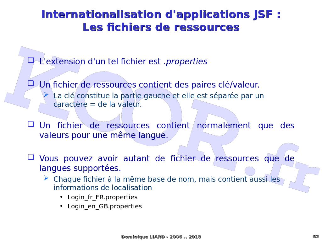 Internationalisation d'applications JSF :Les fichiers de ressources L'extension d'un tel fichier est .properties Un fichier de ressources contient des paires clé/valeur. La clé constitue la partie gauche et elle est séparée par un caractère = de la valeur. Un fichier de ressources contient normalement que des valeurs pour une même langue. Vous pouvez avoir autant de fichier de ressources que de langues supportées. Chaque fichier à la même base de nom, mais contient aussi les informations de localisation Login_fr_FR.properties Login_en_GB.properties Dominique LIARD - 2006 .. 2018