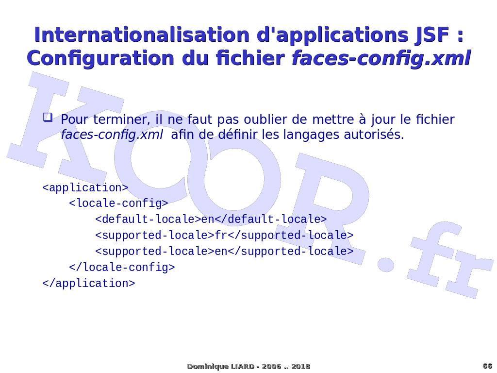 Internationalisation d'applications JSF :Configuration du fichier faces-config.xml Pour terminer, il ne faut pas oublier de mettre à jour le fichier faces-config.xml afin de définir les langages autorisés. <application> <locale-config> <default-locale>en</default-locale> <supported-locale>fr</supported-locale> <supported-locale>en</supported-locale> </locale-config> </application> Dominique LIARD - 2006 .. 2018