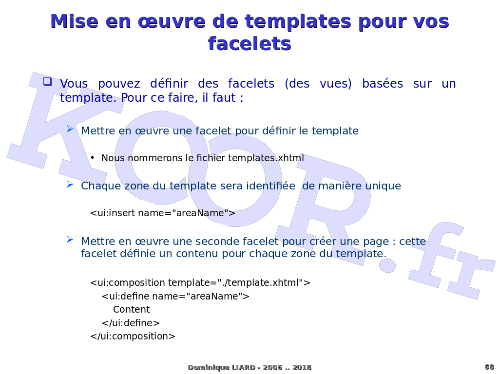 Mise en ?uvre de templates pour vos facelets Vous pouvez définir des facelets (des vues) basées sur un template. Pour ce faire, il faut : Mettre en ?uvre une facelet pour définir le template Nous nommerons le fichier templates.xhtml Chaque zone du template sera identifiée de manière unique <ui:insert name="areaName"> Mettre en ?uvre une seconde facelet pour créer une page : cette facelet définie un contenu pour chaque zone du template. <ui:composition template="./template.xhtml"> <ui:define name="areaName"> Content </ui:define> </ui:composition> Dominique LIARD - 2006 .. 2018