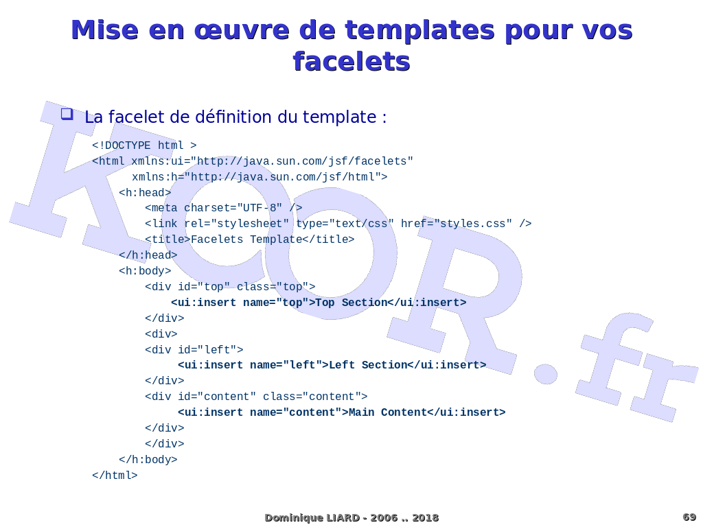 Mise en ?uvre de templates pour vos facelets La facelet de définition du template : <!DOCTYPE html > <html xmlns:ui="http://java.sun.com/jsf/facelets" xmlns:h="http://java.sun.com/jsf/html"> <h:head> <meta charset="UTF-8" /> <link rel="stylesheet" type="text/css" href="styles.css" /> <title>Facelets Template</title> </h:head> <h:body> <div id="top" class="top"> <ui:insert name="top">Top Section</ui:insert> </div> <div> <div id="left"> <ui:insert name="left">Left Section</ui:insert> </div> <div id="content" class="content"> <ui:insert name="content">Main Content</ui:insert> </div> </div> </h:body> </html> Dominique LIARD - 2006 .. 2018