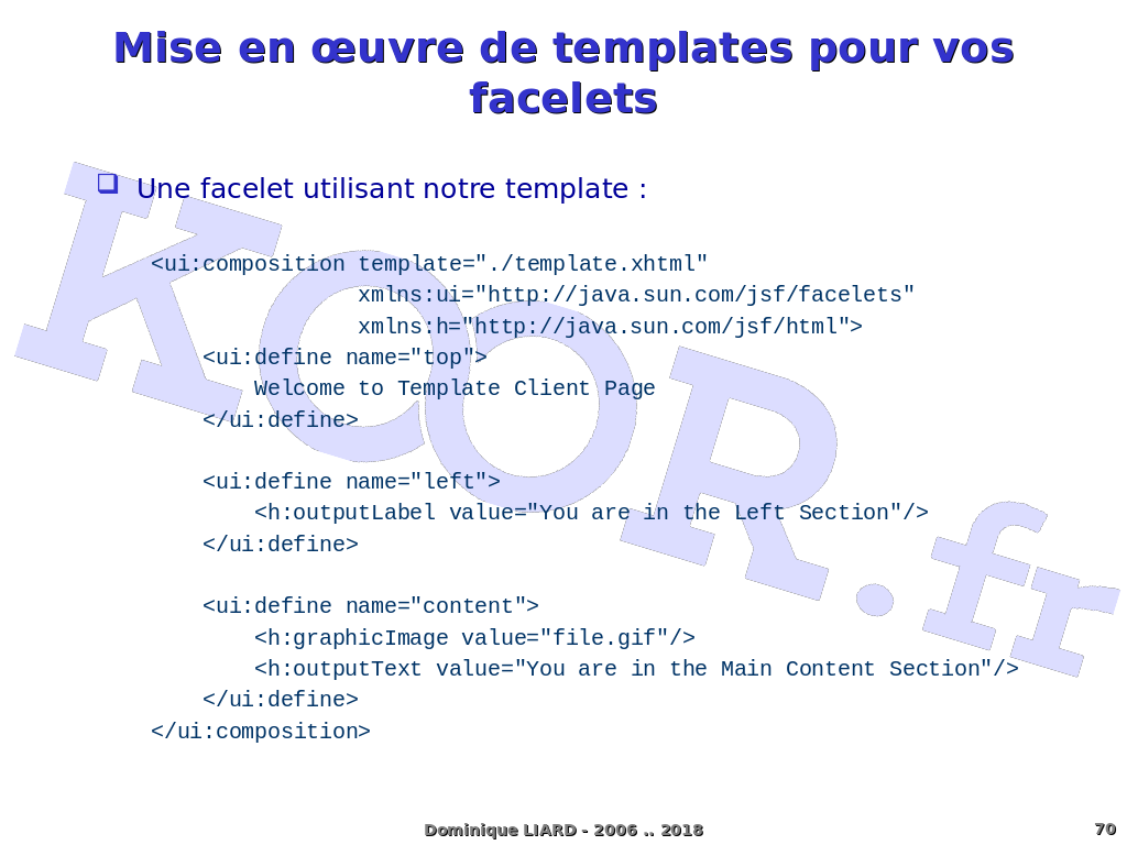 Mise en ?uvre de templates pour vos facelets Une facelet utilisant notre template : <ui:composition template="./template.xhtml" xmlns:ui="http://java.sun.com/jsf/facelets" xmlns:h="http://java.sun.com/jsf/html"> <ui:define name="top"> Welcome to Template Client Page </ui:define> <ui:define name="left"> <h:outputLabel value="You are in the Left Section"/> </ui:define> <ui:define name="content"> <h:graphicImage value="file.gif"/> <h:outputText value="You are in the Main Content Section"/> </ui:define> </ui:composition> Dominique LIARD - 2006 .. 2018