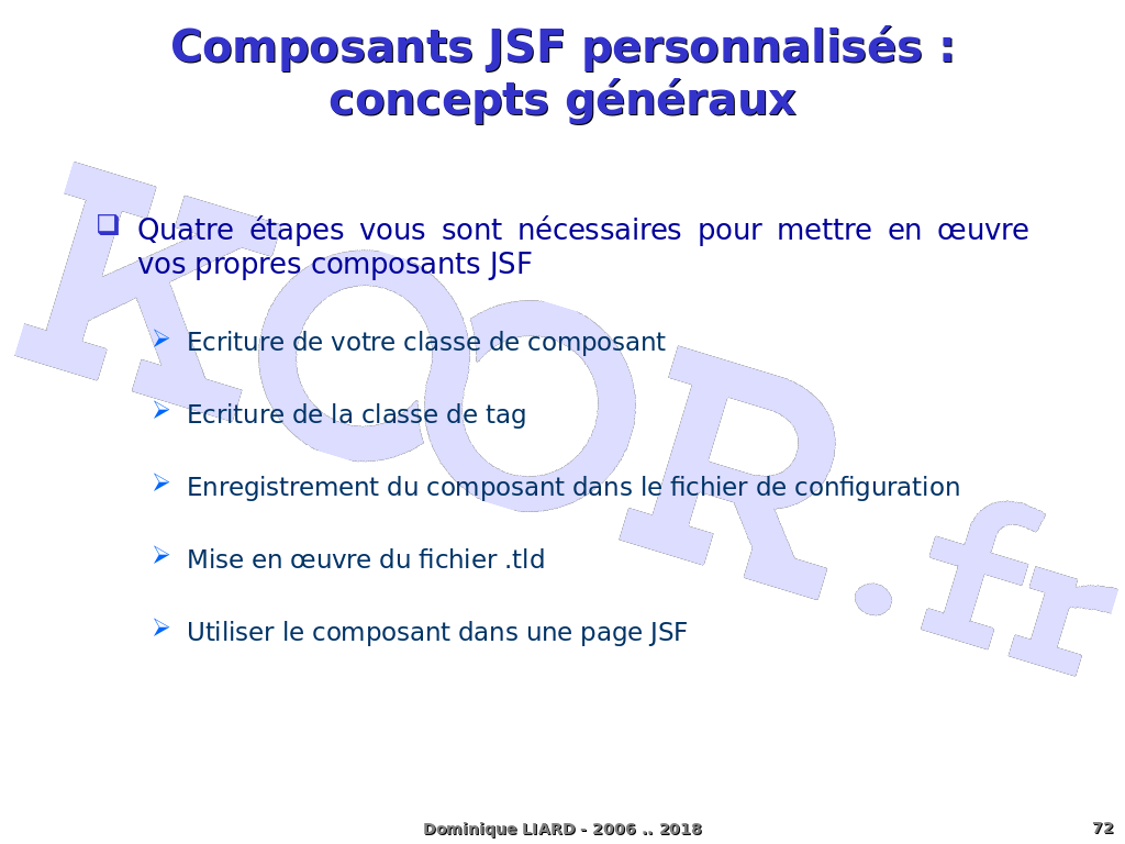 Un composant JSF doit de plus être présent dans le fichier de configuration faces-config.xml. Le nouveau tag doit de plus être décrit dans un fichier de définition de librairie de tags (.tld).