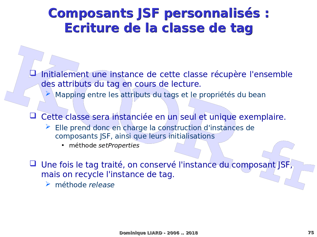Composants JSF personnalisés :Ecriture de la classe de tag Initialement une instance de cette classe récupère l'ensemble des attributs du tag en cours de lecture. Mapping entre les attributs du tags et le propriétés du bean Cette classe sera instanciée en un seul et unique exemplaire. Elle prend donc en charge la construction d'instances de composants JSF, ainsi que leurs initialisations Une fois le tag traité, on conservé l'instance du composant JSF, mais on recycle l'instance de tag. Dominique LIARD - 2006 .. 2018