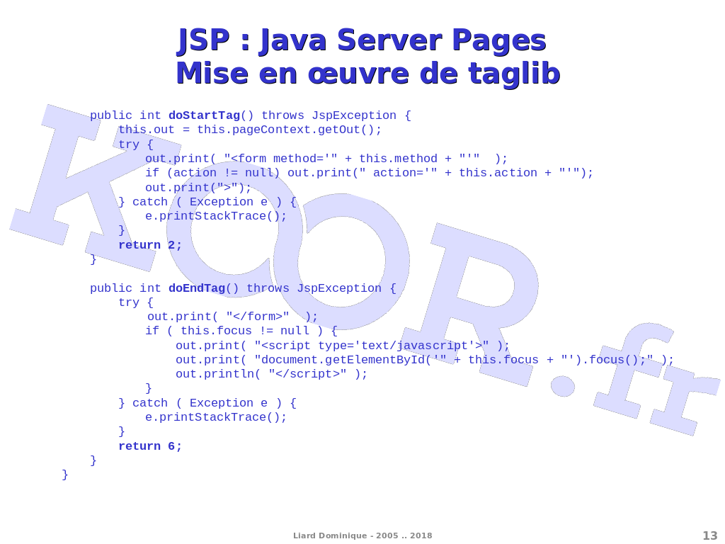 JSP : Java Server Pages Mise en ?uvre de taglib Liard Dominique - 2005 .. 2018 public int doStartTag() throws JspException { this.out = this.pageContext.getOut(); try { out.print( "<form method='" + this.method + "'" ); if (action != null) out.print(" action='" + this.action + "'"); out.print(">"); } catch ( Exception e ) { e.printStackTrace(); } return 2; } public int doEndTag() throws JspException { try { out.print( "</form>" ); if ( this.focus != null ) { out.print( "<script type='text/javascript'>" ); out.print( "document.getElementById('" + this.focus + "').focus();" ); out.println( "</script>" ); } } catch ( Exception e ) { e.printStackTrace(); } return 6; } }