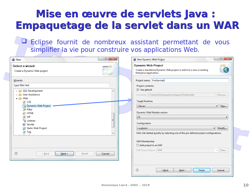 Mise en ?uvre de servlets Java : Empaquetage de la servlet dans un WAR Dominique Liard - 2005 .. 2018 Eclipse fournit de nombreux assistant permettant de vous simplifier la vie pour construire vos applications Web. Notes: Après la construction du projet, la structure de répertoires suivante est créée : elle contient notamment le contenu du war (ici le dossier WebStore).