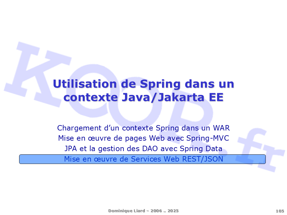 <h1>Utilisation de Spring dans un contexte Java/Jakarta EE</h1> <p>Chargement d'un contexte Spring dans un WAR Mise en oeuvre de pages Web avec Spring-MVC JPA et la gestion des DAO avec Spring Data Mise en oeuvre de Services Web REST/JSON</p>