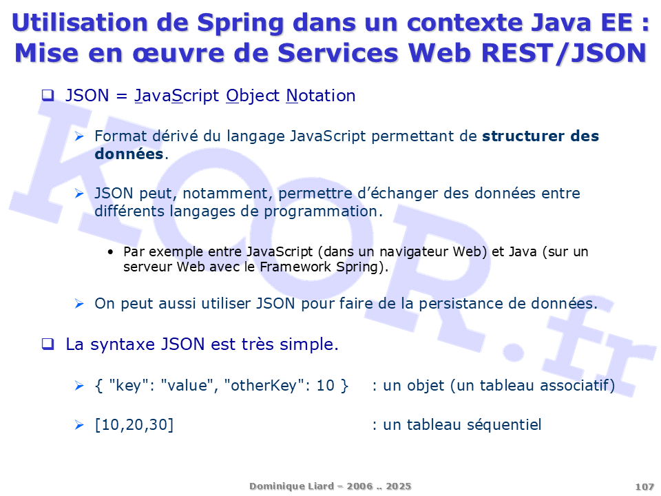 <h1>Utilisation de Spring dans un contexte Java EE - Mise en oeuvre de Services Web REST/JSON</h1> <p>JSON = JavaScript Object Notation Format dérivé du langage JavaScript permettant de structurer des données. JSON peut, notamment, permettre d'échanger des données entre différents langages de programmation. Par exemple entre JavaScript (dans un navigateur Web) et Java (sur un serveur Web avec le Framework Spring). On peut aussi utiliser JSON pour faire de la persistance de données. La syntaxe JSON est très simple. { "key": "value", "otherKey": 10 } : un objet (un tableau associatif) [10,20,30] : un tableau séquentiel</p>