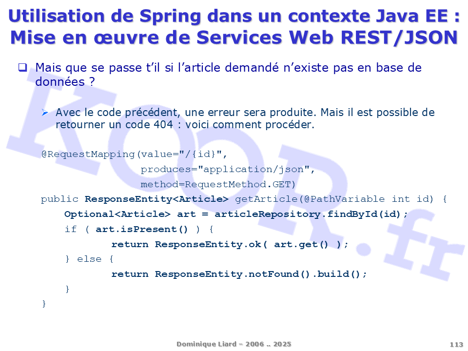 <h1>Utilisation de Spring dans un contexte Java EE - Mise en oeuvre de Services Web REST/JSON</h1> <p>Mais que se passe t'il si l'article demandé n'existe pas en base de données ? Avec le code précédent, une erreur sera produite. Mais il est possible de retourner un code 404 : voici comment procéder. @RequestMapping(value="/{id}", produces="application/json", method=RequestMethod.GET) public ResponseEntity<Article> getArticle(@PathVariable int id) { Optional<Article> art = articleRepository.findById(id); if ( art.isPresent() ) { return ResponseEntity.ok( art.get() ); } else { return ResponseEntity.notFound().build(); } }</p>