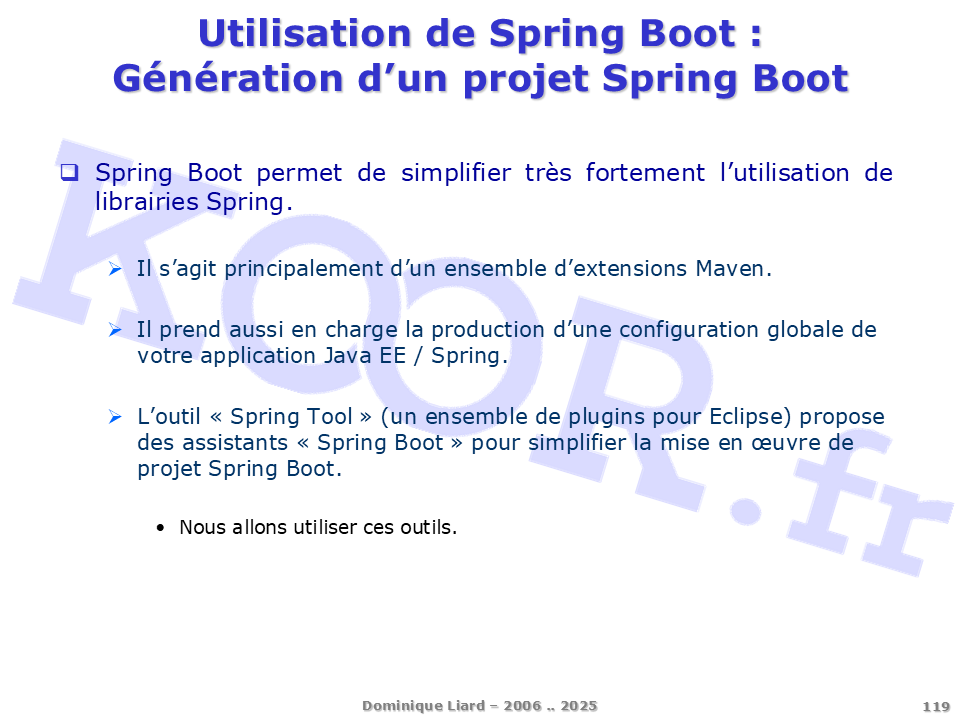 <h1>Utilisation de Spring Boot - Génération d'un projet Spring Boot</h1> <p>Spring Boot permet de simplifier très fortement l'utilisation de librairies Spring. Il s'agit principalement d'un ensemble d'extensions Maven. Il prend aussi en charge la production d'une configuration globale de votre application Java EE / Spring. L'outil « Spring Tool » (un ensemble de plugins pour Eclipse) propose des assistants « Spring Boot » pour simplifier la mise en oeuvre de projet Spring Boot. Nous allons utiliser ces outils.</p>