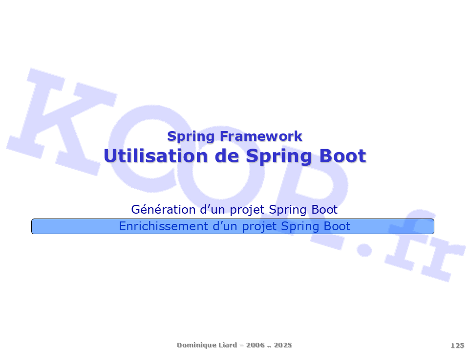 <h1>Utilisation de Spring Boot</h1> <p>Génération d'un projet Spring Boot Enrichissement d'un projet Spring Boot</p> Diapositive précédente Diapositive suivante