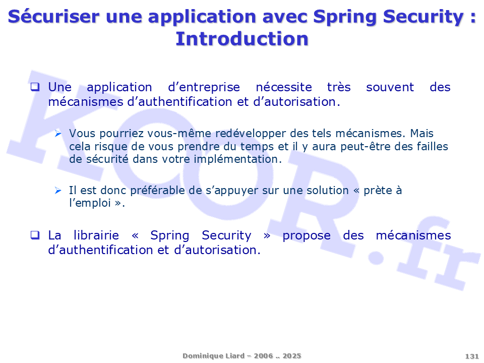 <h1>Sécuriser une application avec Spring Security - Introduction</h1> <p>Une application d'entreprise nécessite très souvent des mécanismes d'authentification et d'autorisation. Vous pourriez vous-même redévelopper des tels mécanismes. Mais cela risque de vous prendre du temps et il y aura peut-être des failles de sécurité dans votre implémentation. Il est donc préférable de s'appuyer sur une solution « prète à l'emploi ». La librairie « Spring Security » propose des mécanismes d'authentification et d'autorisation.</p>