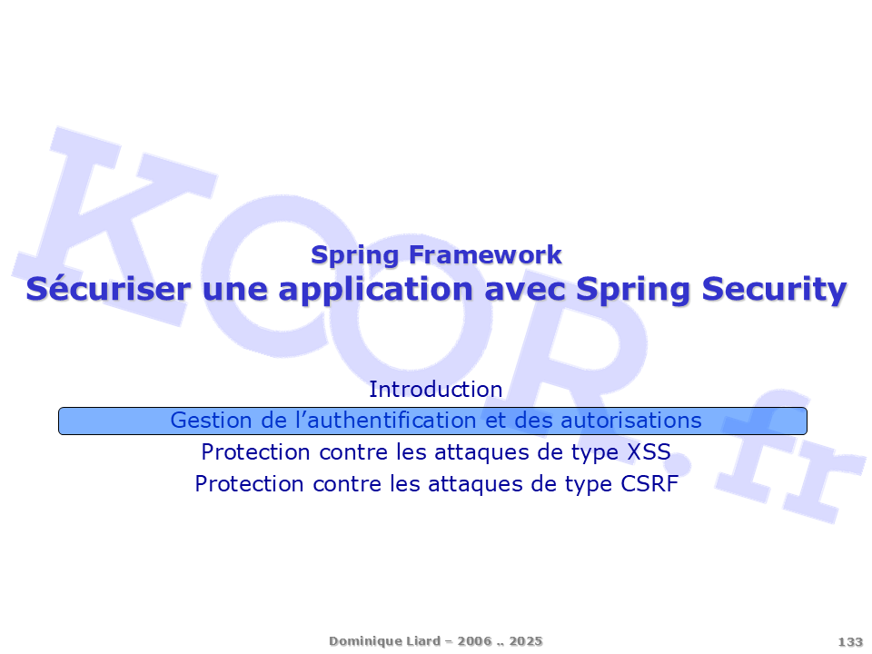 <h1>Sécuriser une application avec Spring Security</h1> <p>Introduction Gestion de l'authentification et des autorisations Protection contre les attaques de type XSS Protection contre les attaques de type CSRF</p>