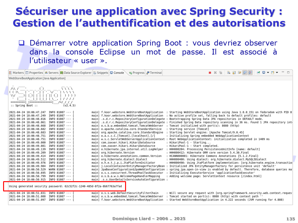 <h1>Sécuriser une application avec Spring Security - Gestion de l'authentification et des autorisations</h1> <p>Démarrer votre application Spring Boot : vous devriez observer dans la console Eclipse un mot de passe. Il est associé à l'utilisateur « user ».</p>