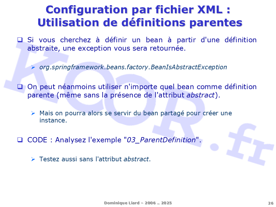 <h1>Configuration par fichier XML - Utilisation de définitions parentes</h1> <p>Si vous cherchez à définir un bean à partir d'une définition abstraite, une exception vous sera retournée. org.springframework.beans.factory.BeanIsAbstractException On peut néanmoins utiliser n'importe quel bean comme définition parente (même sans la présence de l'attribut abstract). Mais on pourra alors se servir du bean partagé pour créer une instance. CODE : Analysez l'exemple "03_ParentDefinition". Testez aussi sans l'attribut abstract.</p>
