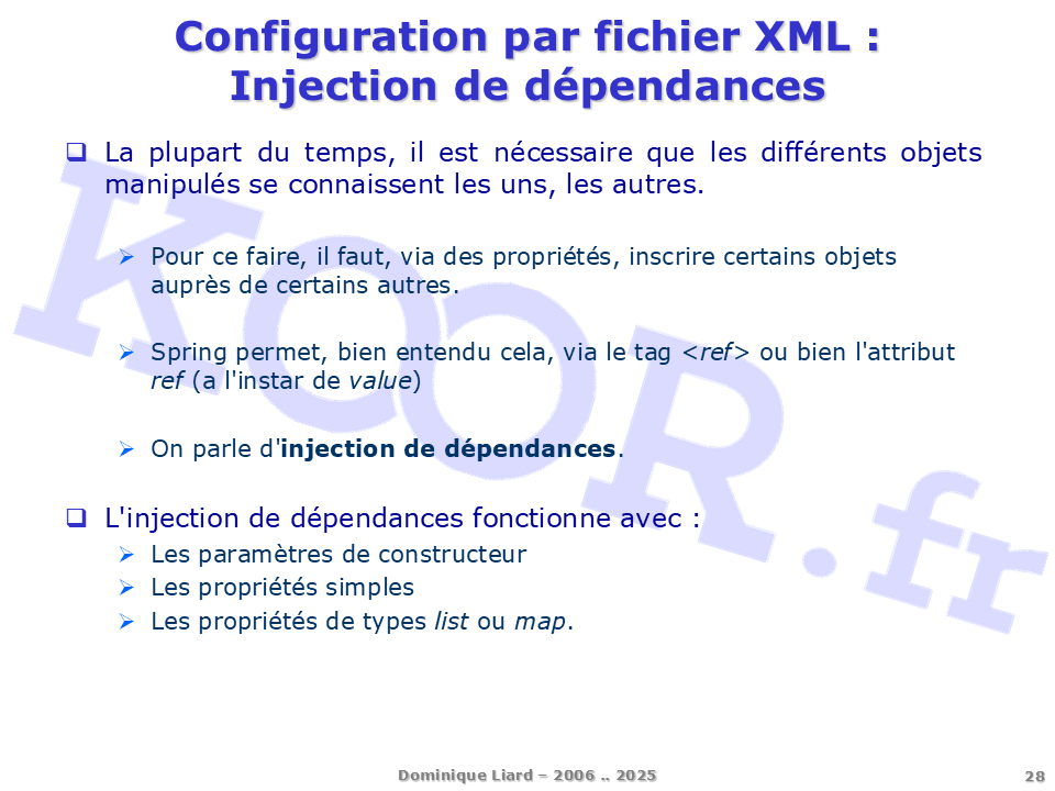 <h1>Configuration par fichier XML - Injection de dépendances</h1> <p>La plupart du temps, il est nécessaire que les différents objets manipulés se connaissent les uns, les autres. Pour ce faire, il faut, via des propriétés, inscrire certains objets auprès de certains autres. Spring permet, bien entendu cela, via le tag <ref> ou bien l'attribut ref (a l'instar de value) On parle d'injection de dépendances. L'injection de dépendances fonctionne avec : Les paramètres de constructeur Les propriétés simples Les propriétés de types list ou map.</p>