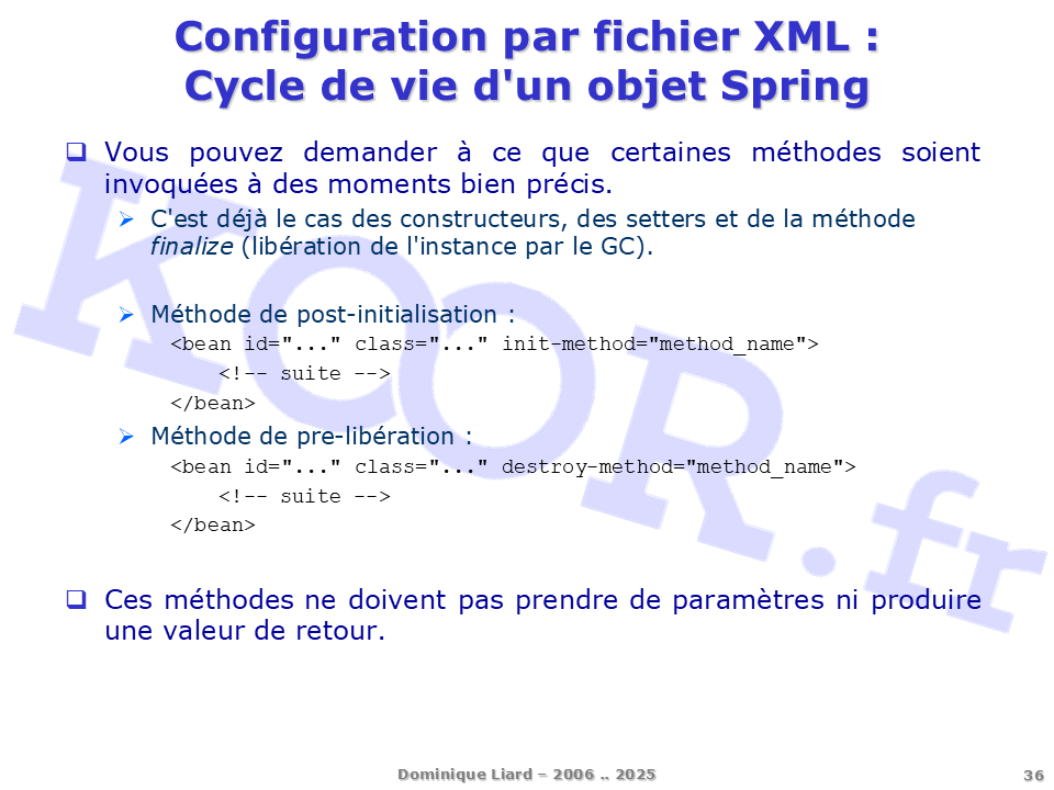 <h1>Configuration par fichier XML - Cycle de vie d'un objet Spring</h1> <p>Vous pouvez demander à ce que certaines méthodes soient invoquées à des moments bien précis. C'est déjà le cas des constructeurs, des setters et de la méthode finalize (libération de l'instance par le GC). Méthode de post-initialisation : <bean id="..." class="..." init-method="method_name"> <!-- suite --> </bean> Méthode de pre-libération : <bean id="..." class="..." destroy-method="method_name"> <!-- suite --> </bean> Ces méthodes ne doivent pas prendre de paramètres ni produire une valeur de retour.</p>