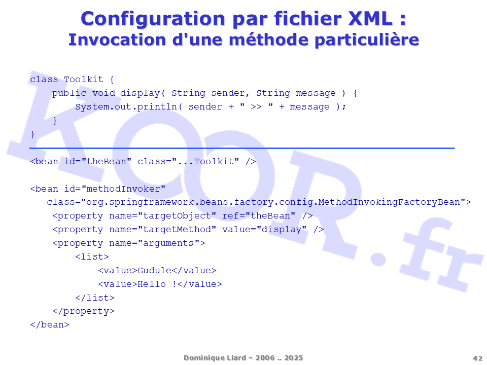 <h1>Configuration par fichier XML - Invocation d'une méthode particulière</h1> <p>class Toolkit { public void display( String sender, String message ) { System.out.println( sender + " >> " + message ); } } <bean id="theBean" class="...Toolkit" /> <bean id="methodInvoker" class="org.springframework.beans.factory.config.MethodInvokingFactoryBean"> <property name="targetObject" ref="theBean" /> <property name="targetMethod" value="display" /> <property name="arguments"> <list> <value>Gudule</value> <value>Hello !</value> </list> </property> </bean></p>