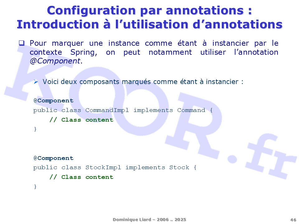 <h1>Configuration par annotations - Introduction à l'utilisation d'annotations</h1> <p>Pour marquer une instance comme étant à instancier par le contexte Spring, on peut notamment utiliser l'annotation @Component. Voici deux composants marqués comme étant à instancier : @Component public class CommandImpl implements Command { // Class content } @Component public class StockImpl implements Stock { // Class content }</p>