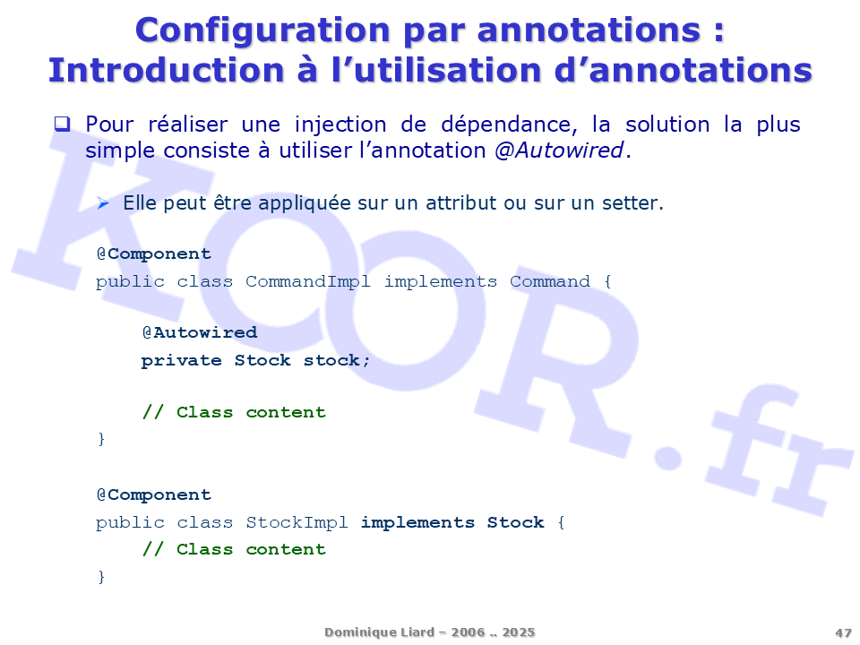 <h1>Configuration par annotations - Introduction à l'utilisation d'annotations</h1> <p>Pour réaliser une injection de dépendance, la solution la plus simple consiste à utiliser l'annotation @Autowired. Elle peut être appliquée sur un attribut ou sur un setter. @Component public class CommandImpl implements Command { @Autowired private Stock stock; // Class content } @Component public class StockImpl implements Stock { // Class content }</p>