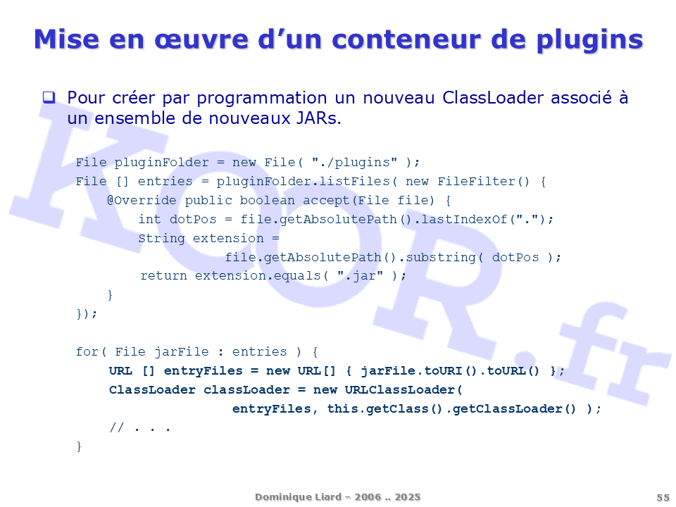 <h1>Mise en oeuvre d'un conteneur de plugins</h1> <p>Pour créer par programmation un nouveau ClassLoader associé à un ensemble de nouveaux JARs. File pluginFolder = new File( "./plugins" ); File [] entries = pluginFolder.listFiles( new FileFilter() { @Override public boolean accept(File file) { int dotPos = file.getAbsolutePath().lastIndexOf("."); String extension = file.getAbsolutePath().substring( dotPos ); return extension.equals( ".jar" ); } }); for( File jarFile : entries ) { URL [] entryFiles = new URL[] { jarFile.toURI().toURL() }; ClassLoader classLoader = new URLClassLoader( entryFiles, this.getClass().getClassLoader() ); // . . . }</p>