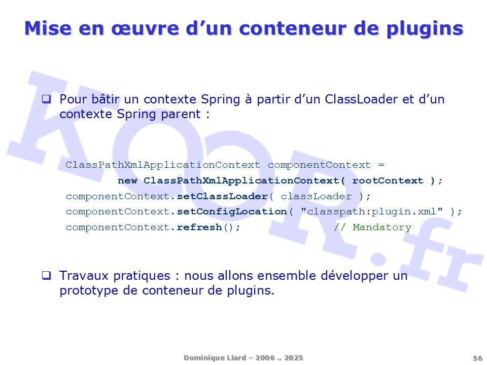 <h1>Mise en oeuvre d'un conteneur de plugins</h1> <p>Pour bâtir un contexte Spring à partir d'un ClassLoader et d'un contexte Spring parent : ClassPathXmlApplicationContext componentContext = new ClassPathXmlApplicationContext( rootContext ); componentContext.setClassLoader( classLoader ); componentContext.setConfigLocation( "classpath:plugin.xml" ); componentContext.refresh(); // Mandatory Travaux pratiques : nous allons ensemble développer un prototype de conteneur de plugins.</p>
