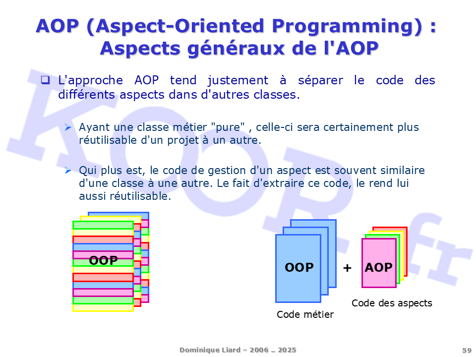 <h1>AOP (Aspect-Oriented Programming) - Aspects généraux de l'AOP</h1> <p>L'approche AOP tend justement à séparer le code des différents aspects dans d'autres classes. Ayant une classe métier "pure" , celle-ci sera certainement plus réutilisable d'un projet à un autre. Qui plus est, le code de gestion d'un aspect est souvent similaire d'une classe à une autre. Le fait d'extraire ce code, le rend lui aussi réutilisable.</p> <p>OOP</p> <p>OOP + AOP</p>