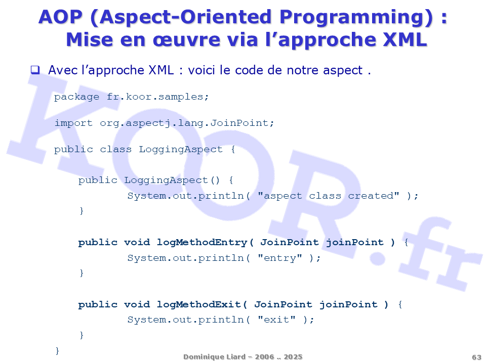 <h1>AOP (Aspect-Oriented Programming) - Mise en oeuvre via l'approche XML</h1> <p>Avec l'approche XML : voici le code de notre aspect . package fr.koor.samples; import org.aspectj.lang.JoinPoint; public class LoggingAspect { public LoggingAspect() { System.out.println( "aspect class created" ); } public void logMethodEntry( JoinPoint joinPoint ) { System.out.println( "entry" ); } public void logMethodExit( JoinPoint joinPoint ) { System.out.println( "exit" ); } }</p>