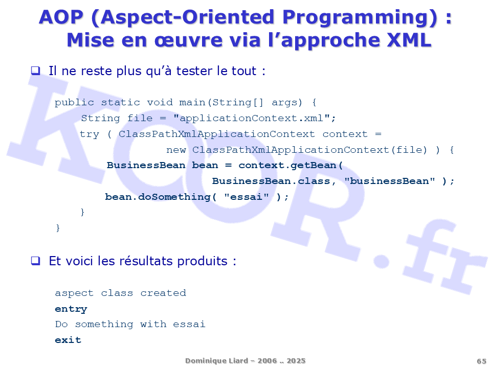 <h1>AOP (Aspect-Oriented Programming) - Mise en oeuvre via l'approche XML</h1> <p>Il ne reste plus qu'à tester le tout : public static void main(String[] args) { String file = "applicationContext.xml"; try ( ClassPathXmlApplicationContext context = new ClassPathXmlApplicationContext(file) ) { BusinessBean bean = context.getBean( BusinessBean.class, "businessBean" ); bean.doSomething( "essai" ); } } Et voici les résultats produits : aspect class created entry Do something with essai exit</p>