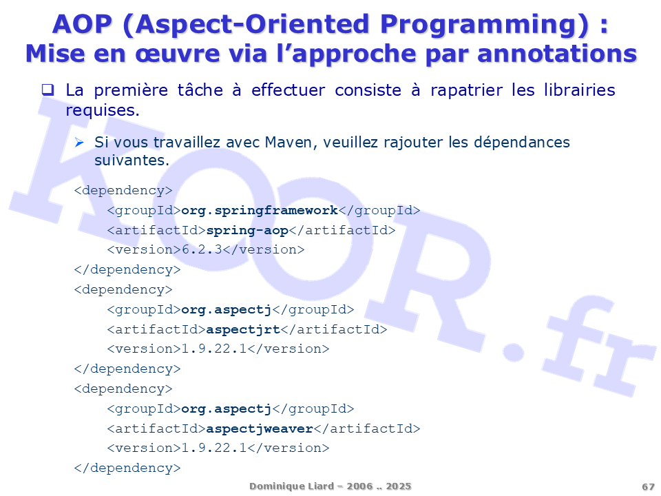 <h1>AOP (Aspect-Oriented Programming) - Mise en oeuvre via l'approche par annotations</h1> <p>La première tâche à effectuer consiste à rapatrier les librairies requises. Si vous travaillez avec Maven, veuillez rajouter les dépendances suivantes. <dependency> <groupId>org.springframework</groupId> <artifactId>spring-aop</artifactId> <version>6.2.3</version> </dependency> <dependency> <groupId>org.aspectj</groupId> <artifactId>aspectjrt</artifactId> <version>1.9.22.1</version> </dependency> <dependency> <groupId>org.aspectj</groupId> <artifactId>aspectjweaver</artifactId> <version>1.9.22.1</version> </dependency></p>