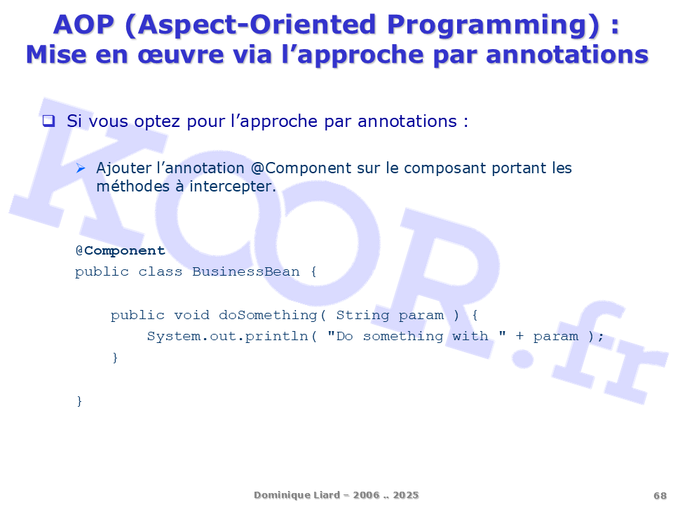<h1>AOP (Aspect-Oriented Programming) - Mise en oeuvre via l'approche par annotations</h1> <p>Si vous optez pour l'approche par annotations : Ajouter l'annotation @Component sur le composant portant les méthodes à intercepter. @Component public class BusinessBean { public void doSomething( String param ) { System.out.println( "Do something with " + param ); } }</p>