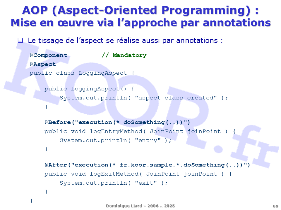 <h1>AOP (Aspect-Oriented Programming) - Mise en oeuvre via l'approche par annotations</h1> <p>Le tissage de l'aspect se réalise aussi par annotations : @Component // Mandatory @Aspect public class LoggingAspect { public LoggingAspect() { System.out.println( "aspect class created" ); } @Before("execution(* doSomething(..))") public void logEntryMethod( JoinPoint joinPoint ) { System.out.println( "entry" ); } @After("execution(* fr.koor.sample.*.doSomething(..))") public void logExitMethod( JoinPoint joinPoint ) { System.out.println( "exit" ); } }</p>