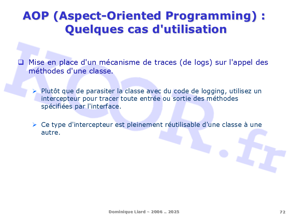 <h1>AOP (Aspect-Oriented Programming) - Quelques cas d'utilisation</h1> <p>Mise en place d'un mécanisme de traces (de logs) sur l'appel des méthodes d'une classe. Plutôt que de parasiter la classe avec du code de logging, utilisez un intercepteur pour tracer toute entrée ou sortie des méthodes spécifiées par l'interface. Ce type d'intercepteur est pleinement réutilisable d'une classe à une autre.</p>
