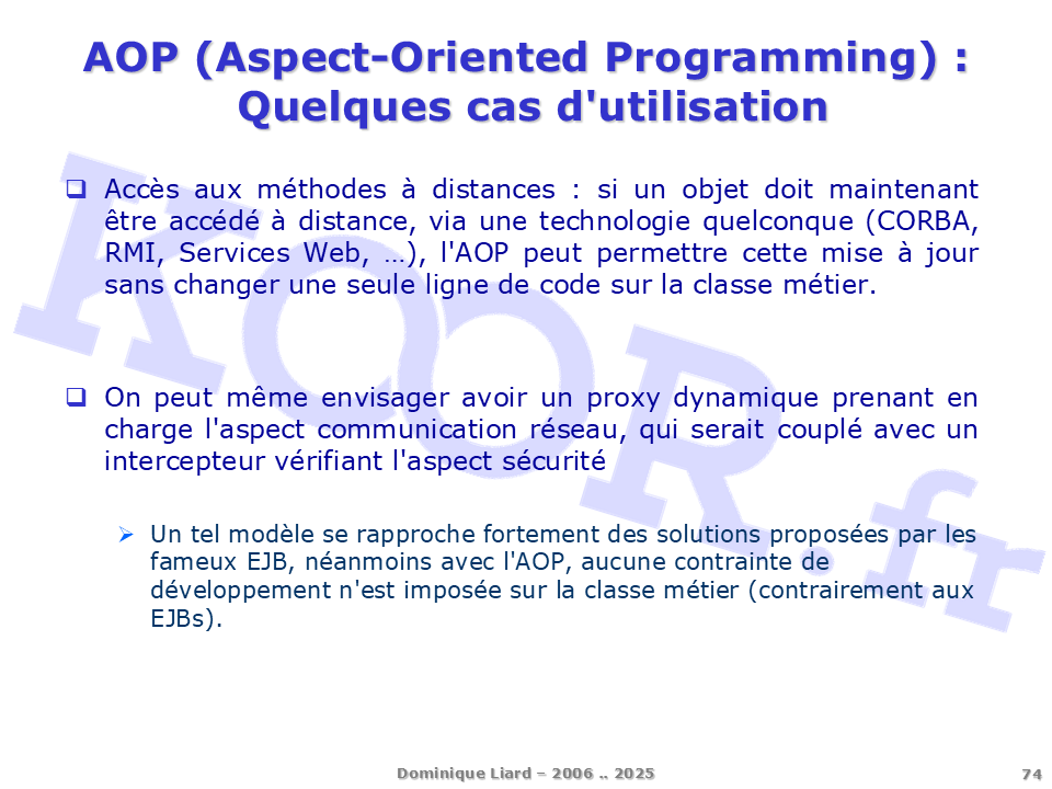 <h1>AOP (Aspect-Oriented Programming) - Quelques cas d'utilisation</h1> <p>Accès aux méthodes à distances : si un objet doit maintenant être accédé à distance, via une technologie quelconque (CORBA, RMI, Services Web, ?), l'AOP peut permettre cette mise à jour sans changer une seule ligne de code sur la classe métier. On peut même envisager avoir un proxy dynamique prenant en charge l'aspect communication réseau, qui serait couplé avec un intercepteur vérifiant l'aspect sécurité Un tel modèle se rapproche fortement des solutions proposées par les fameux EJB, néanmoins avec l'AOP, aucune contrainte de développement n'est imposée sur la classe métier (contrairement aux EJBs).</p>