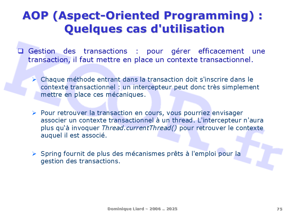<h1>AOP (Aspect-Oriented Programming) - Quelques cas d'utilisation</h1> <p>Gestion des transactions : pour gérer efficacement une transaction, il faut mettre en place un contexte transactionnel. Chaque méthode entrant dans la transaction doit s'inscrire dans le contexte transactionnel : un intercepteur peut donc très simplement mettre en place ces mécaniques. Pour retrouver la transaction en cours, vous pourriez envisager associer un contexte transactionnel à un thread. L'intercepteur n'aura plus qu?à invoquer Thread.currentThread() pour retrouver le contexte auquel il est associé. Spring fournit de plus des mécanismes prêts à l'emploi pour la gestion des transactions.</p>