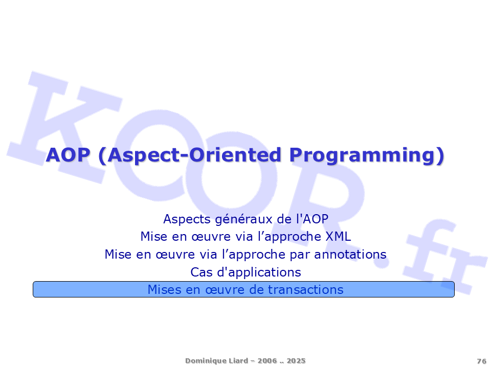 <h1>AOP (Aspect-Oriented Programming)</h1> <p>Aspects généraux de l'AOP Mise en oeuvre via l'approche XML Mise en oeuvre via l'approche par annotations Cas d'applications Mises en oeuvre de transactions</p>