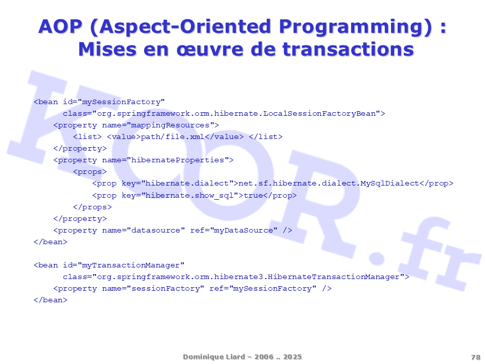 <h1>AOP (Aspect-Oriented Programming) - Mises en oeuvre de transactions</h1> <p><bean id="mySessionFactory" class="org.springframework.orm.hibernate.LocalSessionFactoryBean"> <property name="mappingResources"> <list> <value>path/file.xml</value> </list> </property> <property name="hibernateProperties"> <props> <prop key="hibernate.dialect">net.sf.hibernate.dialect.MySqlDialect</prop> <prop key="hibernate.show_sql">true</prop> </props> </property> <property name="datasource" ref="myDataSource" /> </bean> <bean id="myTransactionManager" class="org.springframework.orm.hibernate3.HibernateTransactionManager"> <property name="sessionFactory" ref="mySessionFactory" /> </bean></p>