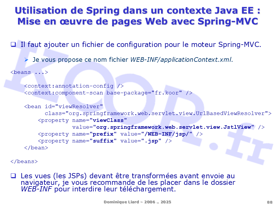 <h1>Utilisation de Spring dans un contexte Java EE - Mise en oeuvre de pages Web avec Spring-MVC</h1> <p>Il faut ajouter un fichier de configuration pour le moteur Spring-MVC. Je vous propose ce nom fichier WEB-INF/applicationContext.xml. <beans ...> <context:annotation-config /> <context:component-scan base-package="fr.koor" /> <bean id="viewResolver" class="org.springframework.web.servlet.view.UrlBasedViewResolver"> <property name="viewClass" value="org.springframework.web.servlet.view.JstlView" /> <property name="prefix" value="/WEB-INF/jsp/" /> <property name="suffix" value=".jsp" /> </bean> </beans> Les vues (les JSPs) devant être transformées avant envoie au navigateur, je vous recommande de les placer dans le dossier WEB-INF pour interdire leur téléchargement.</p>