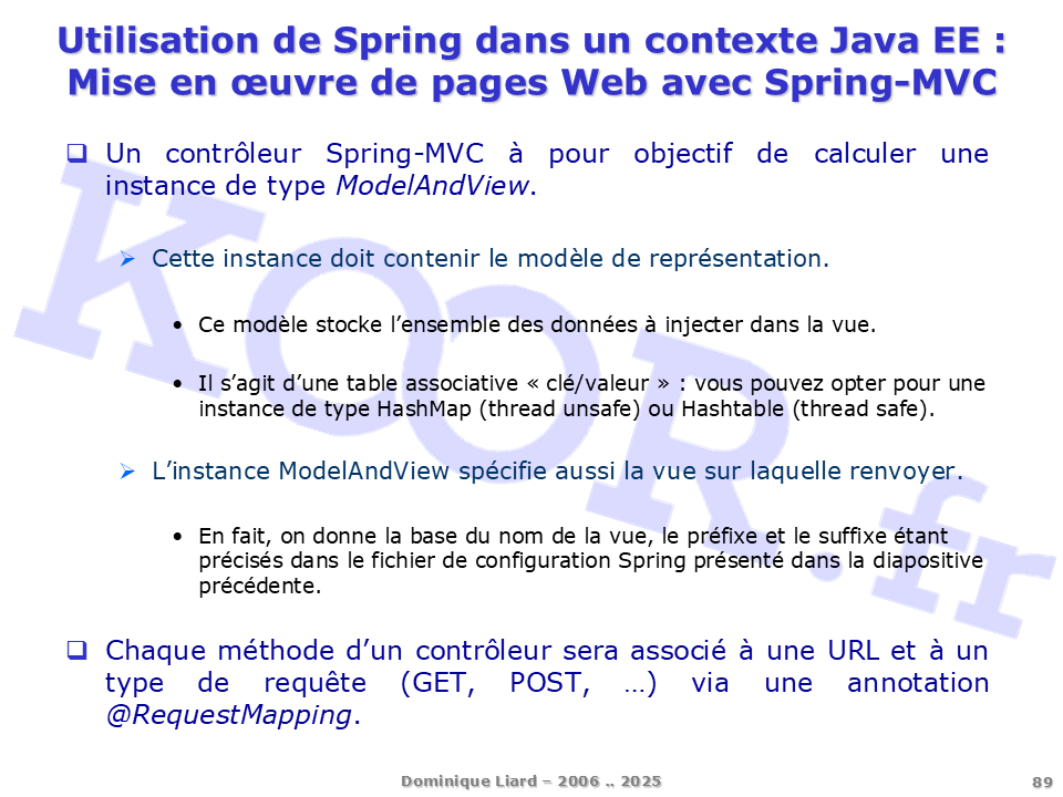 <h1>Utilisation de Spring dans un contexte Java EE - Mise en oeuvre de pages Web avec Spring-MVC</h1> <p>Un contrôleur Spring-MVC à pour objectif de calculer une instance de type ModelAndView. Cette instance doit contenir le modèle de représentation. Ce modèle stocke l'ensemble des données à injecter dans la vue. Il s'agit d'une table associative « clé/valeur » : vous pouvez opter pour une instance de type HashMap (thread unsafe) ou Hashtable (thread safe). L'instance ModelAndView spécifie aussi la vue sur laquelle renvoyer. En fait, on donne la base du nom de la vue, le préfixe et le suffixe étant précisés dans le fichier de configuration Spring présenté dans la diapositive précédente. Chaque méthode d'un contrôleur sera associé à une URL et à un type de requête (GET, POST, ?) via une annotation @RequestMapping.</p>