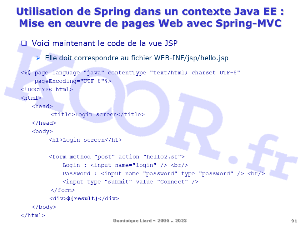 <h1>Utilisation de Spring dans un contexte Java EE - Mise en oeuvre de pages Web avec Spring-MVC</h1> <p>Voici maintenant le code de la vue JSP Elle doit correspondre au fichier WEB-INF/jsp/hello.jsp <%@ page language="java" contentType="text/html; charset=UTF-8" pageEncoding="UTF-8"%> <!DOCTYPE html> <html> <head> <title>Login screen</title> </head> <body> <h1>Login screen</h1> <form method="post" action="hello2.sf"> Login : <input name="login" /> <br/> Password : <input name="password" type="password" /> <br/> <input type="submit" value="Connect" /> </form> <div>${result}</div> </body> </html></p>