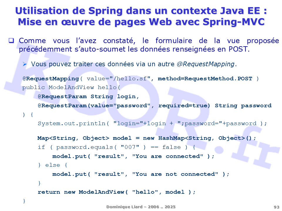 <h1>Utilisation de Spring dans un contexte Java EE - Mise en oeuvre de pages Web avec Spring-MVC</h1> <p>Comme vous l'avez constaté, le formulaire de la vue proposée précédemment s'auto-soumet les données renseignées en POST. Vous pouvez traiter ces données via un autre @RequestMapping. @RequestMapping( value="/hello.sf", method=RequestMethod.POST ) public ModelAndView hello( @RequestParam String login, @RequestParam(value="password", required=true) String password ) { System.out.println( "login="+login + ";password="+password ); Map<String, Object> model = new HashMap<String, Object>(); if ( password.equals( "007" ) == false ) { model.put( "result", "You are connected" ); } else { model.put( "result", "You are not connected" ); } return new ModelAndView( "hello", model ); }</p>