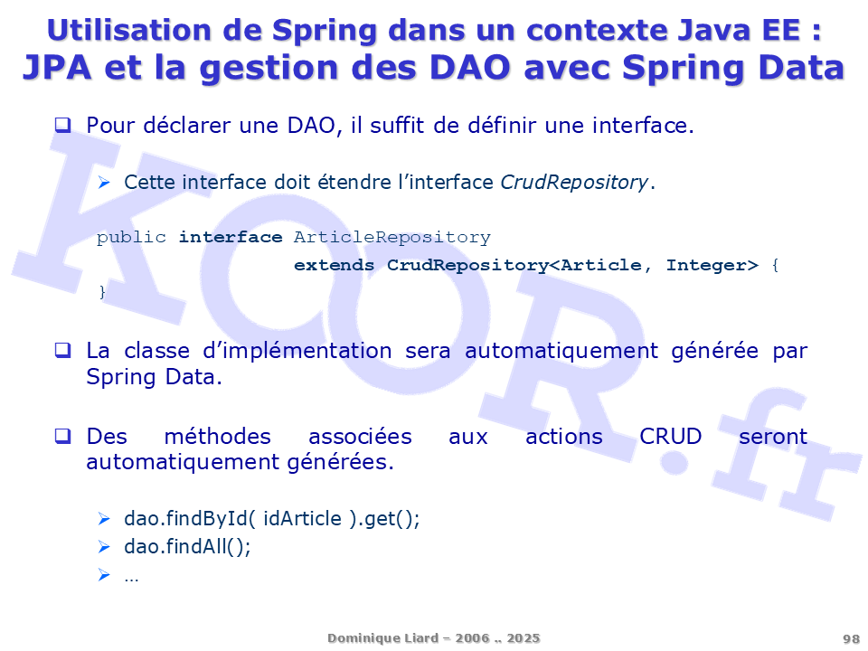 <h1>Utilisation de Spring dans un contexte Java EE - JPA et la gestion des DAO avec Spring Data</h1> <p>Pour déclarer une DAO, il suffit de définir une interface. Cette interface doit étendre l'interface CrudRepository. public interface ArticleRepository extends CrudRepository<Article, Integer> { } La classe d'implémentation sera automatiquement générée par Spring Data. Des méthodes associées aux actions CRUD seront automatiquement générées. dao.findById( idArticle ).get(); dao.findAll(); ?</p>