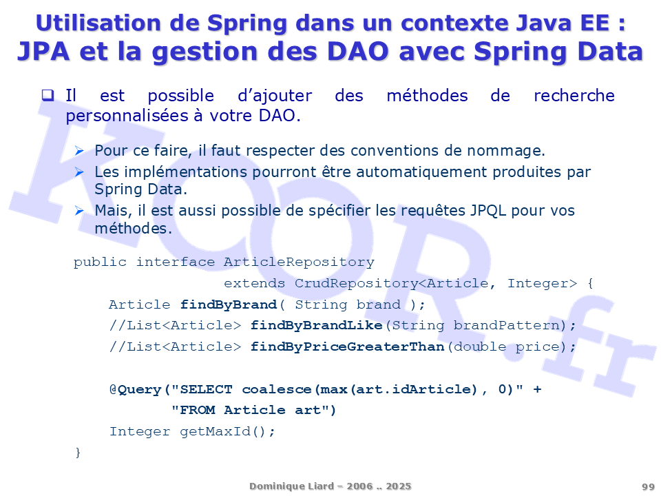 <h1>Utilisation de Spring dans un contexte Java EE - JPA et la gestion des DAO avec Spring Data</h1> <p>Il est possible d'ajouter des méthodes de recherche personnalisées à votre DAO. Pour ce faire, il faut respecter des conventions de nommage. Les implémentations pourront être automatiquement produites par Spring Data. Mais, il est aussi possible de spécifier les requêtes JPQL pour vos méthodes. public interface ArticleRepository extends CrudRepository<Article, Integer> { Article findByBrand( String brand ); //List<Article> findByBrandLike(String brandPattern); //List<Article> findByPriceGreaterThan(double price); @Query("SELECT coalesce(max(art.idArticle), 0)" + "FROM Article art") Integer getMaxId(); }</p>