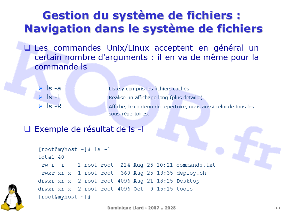 Gestion du système de fichiers - Navigation dans le système de fichiers Les commandes Unix/Linux acceptent en général un certain nombre d'arguments : il en va de même pour la commande ls ls -a Liste y compris les fichiers cachés ls -l Réalise un affichage long (plus détaillé) ls -R Affiche, le contenu du répertoire, mais aussi celui de tous les sous-répertoires. Exemple de résultat de ls -l [root@myhost ~]# ls -l total 40 -rw-r--r-- 1 root root 214 Aug 25 10:21 commands.txt -rwxr-xr-x 1 root root 369 Aug 25 13:35 deploy.sh drwxr-xr-x 2 root root 4096 Aug 21 18:25 Desktop drwxr-xr-x 2 root root 4096 Oct 9 15:15 tools [root@myhost ~]#