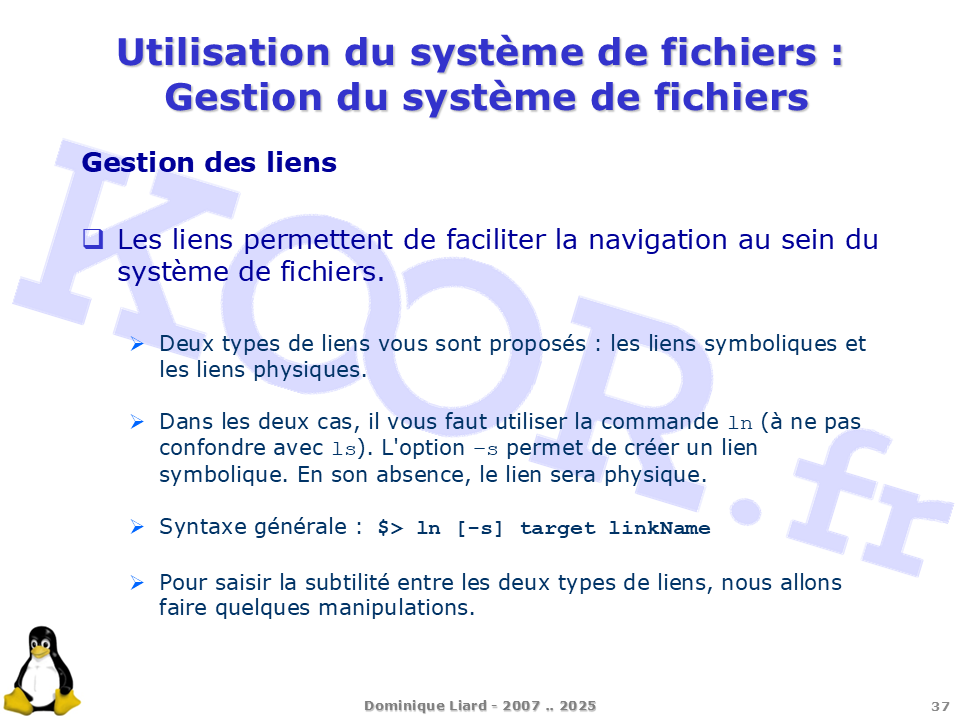 Utilisation du système de fichiers - Gestion du système de fichiers Gestion des liens Les liens permettent de faciliter la navigation au sein du système de fichiers. Deux types de liens vous sont proposés : les liens symboliques et les liens physiques. Dans les deux cas, il vous faut utiliser la commande ln (à ne pas confondre avec ls). L'option ?s permet de créer un lien symbolique. En son absence, le lien sera physique. Syntaxe générale : $> ln [-s] target linkName Pour saisir la subtilité entre les deux types de liens, nous allons faire quelques manipulations.