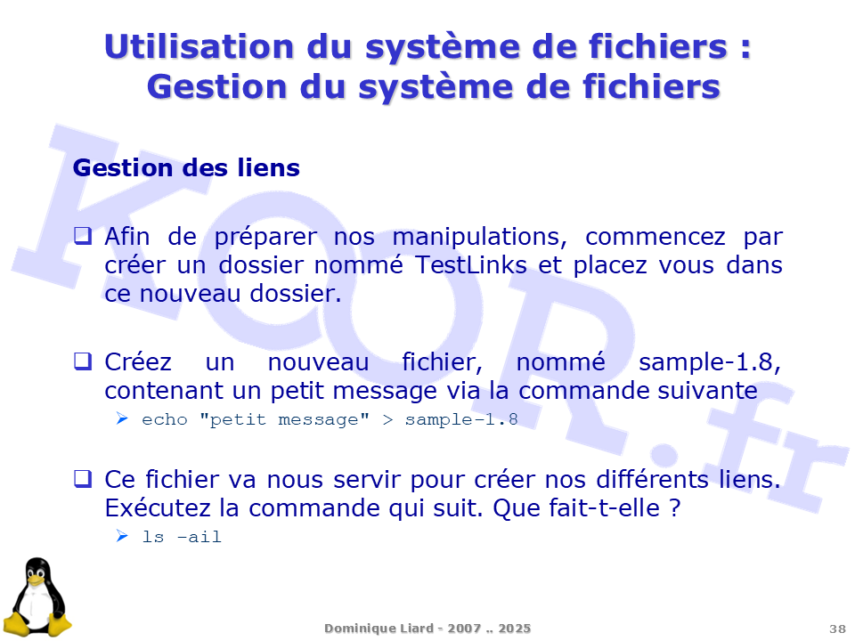 Utilisation du système de fichiers - Gestion du système de fichiers Gestion des liens Afin de préparer nos manipulations, commencez par créer un dossier nommé TestLinks et placez vous dans ce nouveau dossier. Créez un nouveau fichier, nommé sample-1.8, contenant un petit message via la commande suivante echo "petit message" > sample-1.8 Ce fichier va nous servir pour créer nos différents liens. Exécutez la commande qui suit. Que fait-t-elle ? ls -ail