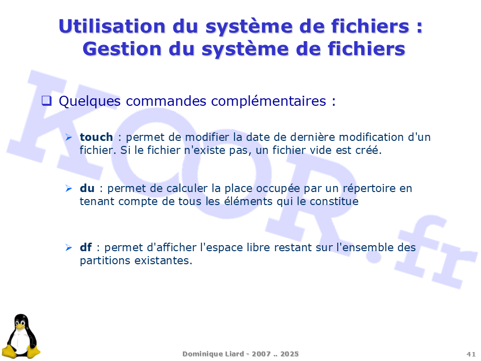 Utilisation du système de fichiers - Gestion du système de fichiers Quelques commandes complémentaires : touch : permet de modifier la date de dernière modification d'un fichier. Si le fichier n'existe pas, un fichier vide est créé. du : permet de calculer la place occupée par un répertoire en tenant compte de tous les éléments qui le constitue df : permet d'afficher l'espace libre restant sur l'ensemble des partitions existantes.