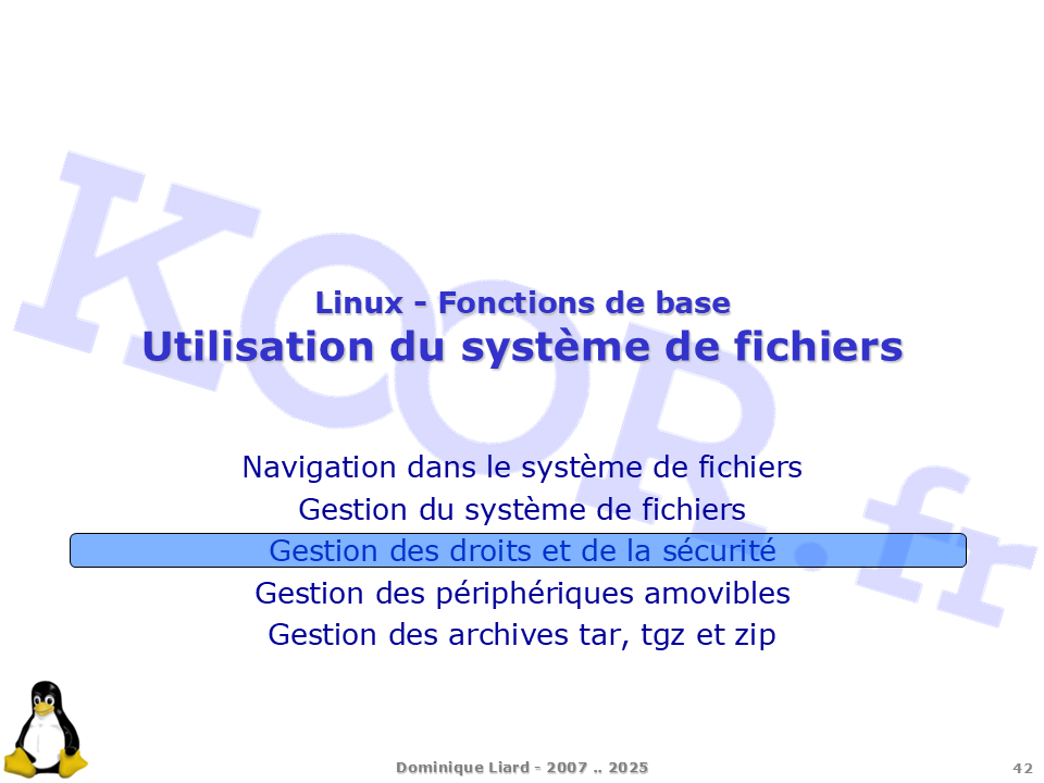 Navigation dans le système de fichiers Gestion du système de fichiers Gestion des droits et de la sécurité Gestion des périphériques amovibles Gestion des archives tar, tgz et zip