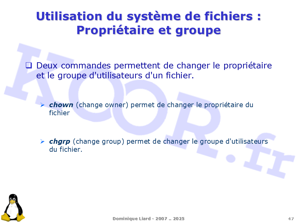 Utilisation du système de fichiers - Propriétaire et groupe Deux commandes permettent de changer le propriétaire et le groupe d'utilisateurs d'un fichier. chown (change owner) permet de changer le propriétaire du fichier chgrp (change group) permet de changer le groupe d'utilisateurs du fichier.