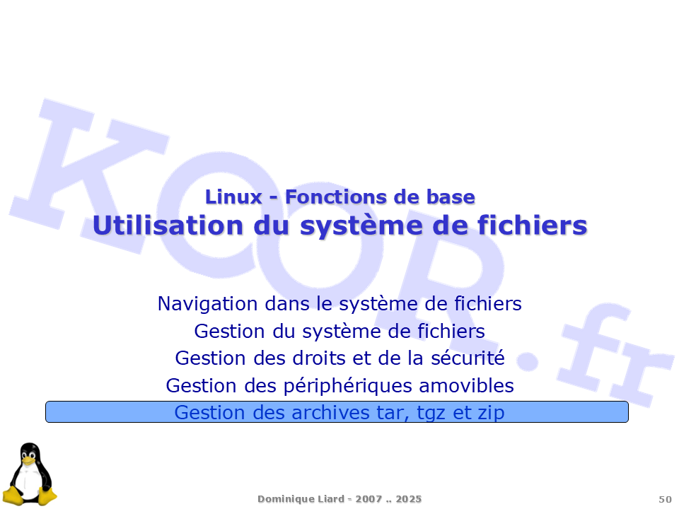 Navigation dans le système de fichiers Gestion du système de fichiers Gestion des droits et de la sécurité Gestion des périphériques amovibles Gestion des archives tar, tgz et zip
