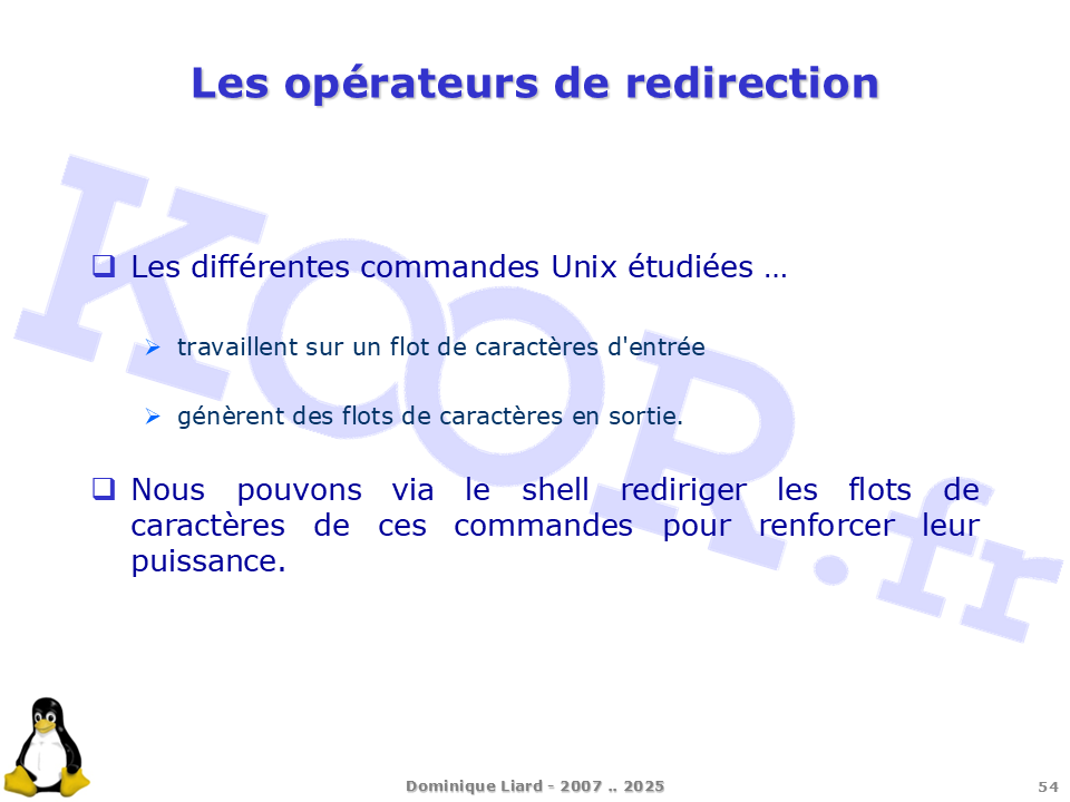 Les opérateurs de redirection Les différentes commandes Unix étudiées ? travaillent sur un flot de caractères d'entrée génèrent des flots de caractères en sortie. Nous pouvons via le shell rediriger les flots de caractères de ces commandes pour renforcer leur puissance.